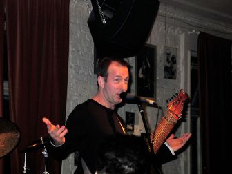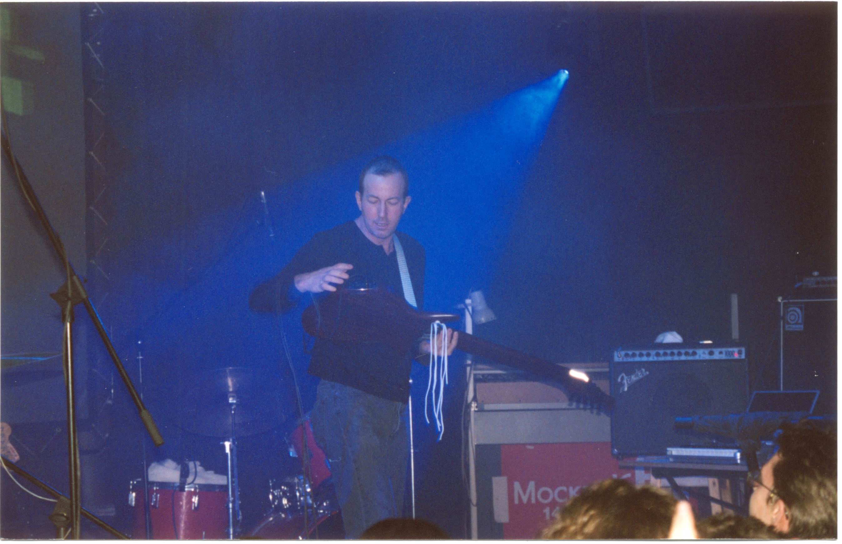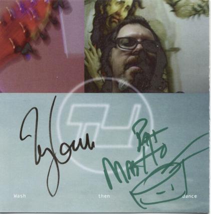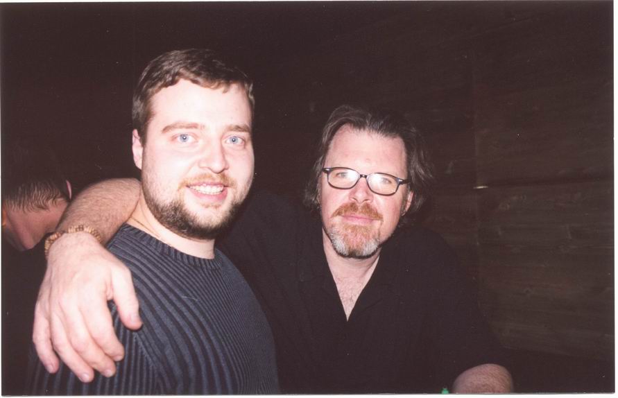 Кстати, приобретя после концерта диск и разглядев обложку, понял этимологию названия TU, это никакие ни "2", типа "двое" из КС, а слившиеся Т (Тrey) и перевернутое зеркалное отражение P (Pat - как мягкий знак наоборот). Автографы после концертов давали оба сразу (16 апреля это было около 2 ночи) и с удовольствием. У меня теперь на обложке диска тоже имеется подобие пионерского барабана. Что до самого диска, то это, конечно, очень здорово, но живьём лучше в разы. Концерт 17 апреля радикально от предыдущего не отличался. Во-первых, фильм в начале демонстрировался другой, хотя всё того же Куросавы. Во-вторых, вначале у Трэя была какая-то накладка со звуком, причём, звуки он какие-то извлекал, но явно беднее, чем днём раньше, что его несказанно расстраивало. Зато, когда всё наладили, музыка получилась более структурированной, чем 16-го, от чего это зависит, так и не понял. Следующее отличие - польские Sonus Acobats (Andrzej Izdebski и Michael Gos), которые особо не впечатлили, хотя напялить футболку Modern Talking, конечно, было весьма концептуально. Гитарист извлекал из своего аппарата звуки, похожие то на завывание ветра, то на предсмертную песнь пылесоса, но испортить впечатление от концерта так и не смог, а вот барабанщик, который в отличие от земляка, не изображал одержимого, понравился куда больше. Несмотря на то, что он оказался на одной сцене с Пэтом, играл он великолепно, хотя новаторской его манеру не назовёшь. Кстати, фото, помещённые в этом номере, сделаны именно 17 апреля. Было и третье выступление: обещанная after-party в понедельник после концерта Дэвида Силвиана (концерт был чумовой, хотя меня расстроило отсутствие вещей с Damage, не считая Jean The Birdman и неприличное количество вспышек, несмотря на просьбу Чепарухина перед концертом). Пэт и Трэй торопились на поезд, поэтому, по словам Трэя, старались извлечь как можно больше нот за оставшееся до отъезда время. Расстарались они на славу, музыка была попроще и поритмичнее, снова нарисовались поляки, причем гитариста, похоже, отпустил страшный недуг, сразивший его накануне, и он играл на гитаре, причем довольно неплохо. Правда, у Трэя опять что-то не ладилось со звуком, поэтому он к ужасу звукоинженера периодически колотил по аппарату, чем, впрочем, добивался желаемого результата. Несколько раздражало обилие толпящихся вокруг музыкантов зрителей. Выступали на этот раз на другой площадке, в джаз-клубе "Cool train" (видимо, намек на Колтрэйна), где публику размещают за столиками. Поэтому те, кто, как и положено, сидел на своих местах, были вынуждены разглядывать TU между телами стоящих, некоторые из которых сохраняли вертикальное положение только благодаря поддержке более трезвых друзей. За фотографии с after-party большое спасибо Андрею Липатову: