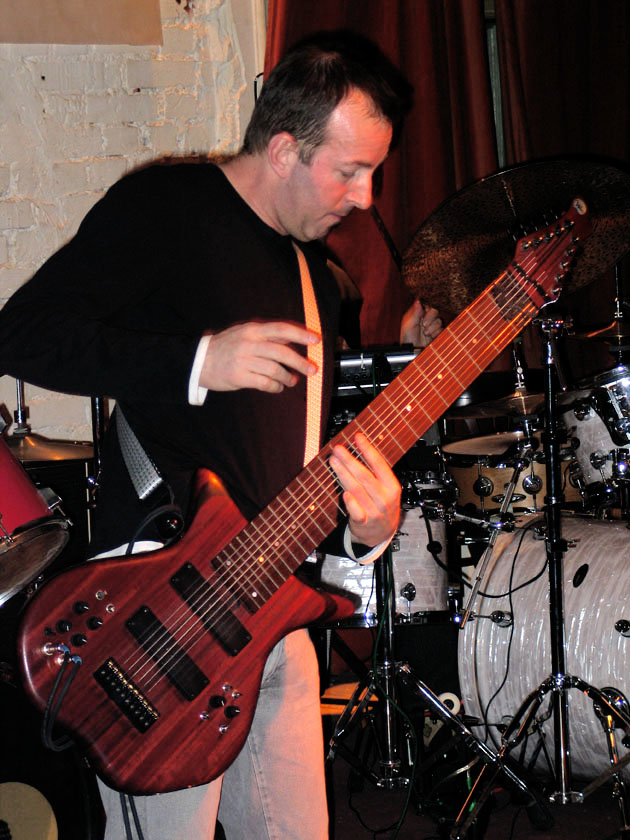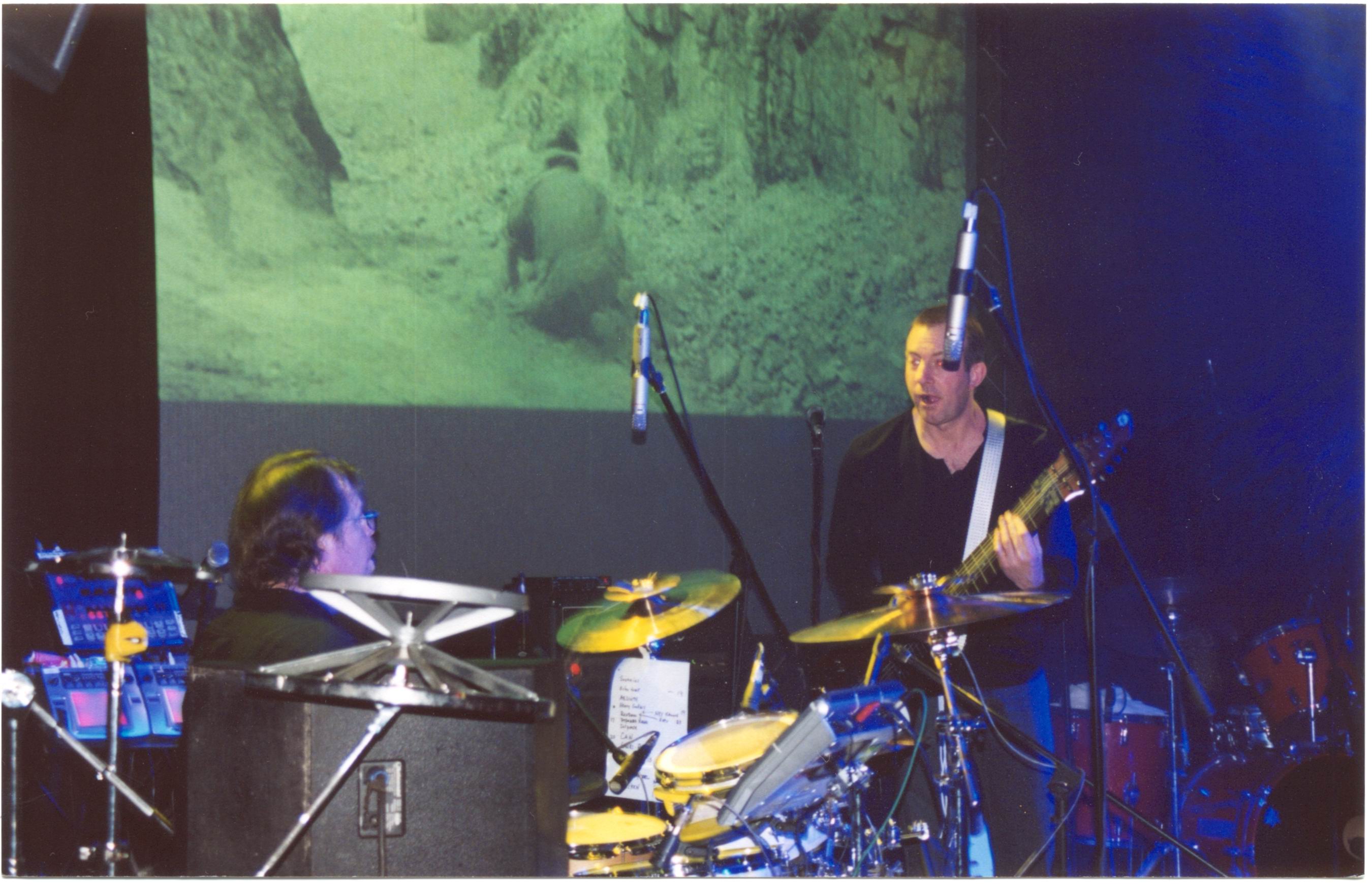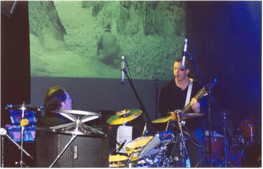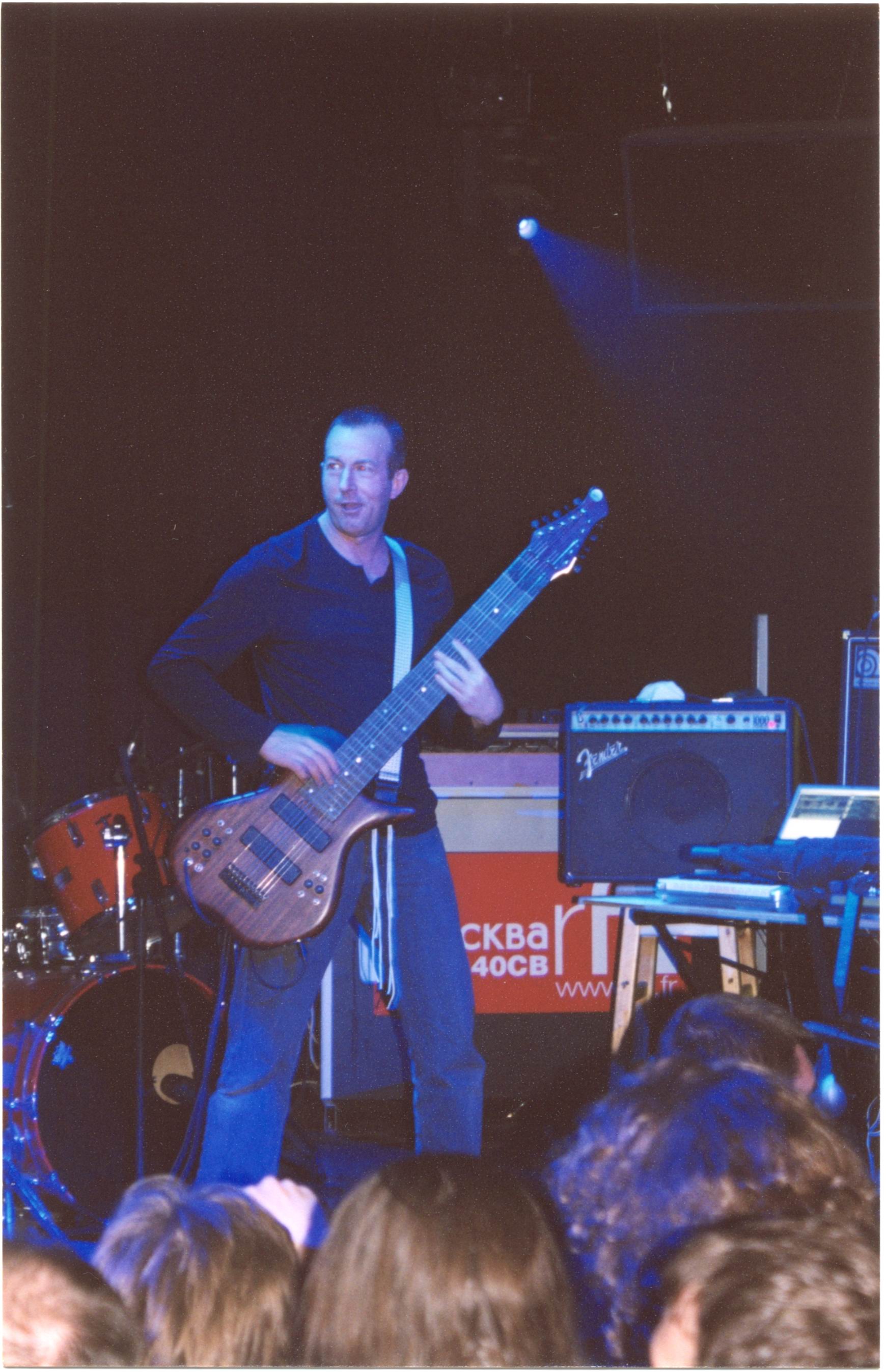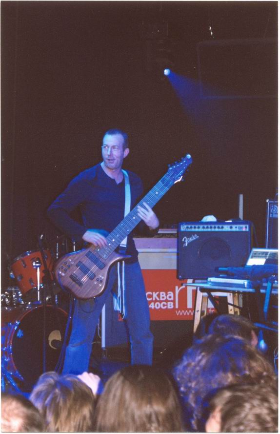 (Все фотографии этого номера доступны в высоком разрешении - кликайте на картинку). Сперва (15 апреля 2004 г.) состоялся концерт в Санкт-Петербурге, который, разумеется, посетил Евгений Поляков. Вот его впечатления (16.04.2004): Не имею никаких слов описать произошедшее. Никак не мог предположить, что работа ритм-секции в одиночку может хотя бы приближаться к тому, свидетелем (и сослушателем) чего мне довелось быть. Правда, Трей Ганн это не просто басс-гитара, а Пэт Мастелотто не просто ударные. Но еще лучше. Не говорю уже, что это было первое клубное выступление, которое мне довелось посмотреть в жизни. Из-за никакой рекламы (весьма невзрачные афишки были расклеены в основном на подходах и подъездах к клубу "Старый дом"), также из-за удаленности (представьте, что вам по меркам Москвы надо добираться 20 мин. по раздолбанной дороге на маршрутке от ВДНХ) народу было немного - человек 300-400. В продаже были пиво и другие напитки и закуски. Никто не нажрался. Качество звука было безупречное. Впрочем, я стоял слишком близко, чтобы заметить огрехи. Билеты стоили 350/500/900 за вход/столик/VIP. Качество мест было строго обратно пропорционально цене. Пришедшие на входные места за 15 минут могли совершенно без толкотни разместиться на расстоянии одного-двух метров напротив Трея Ганна или Мастелотто на выбор. Поскольку я ожидал иного, то приехал аж за 2 часа, о чем не пожалел, так как попал на саунд-чек до такой степени, что даже смог залезть на сцену и снять несколько кадров со спины Мастелотто. А также пресловутую десятиструнную (басовые струны в центре) touch-guitar'у Ганна. Он, конечно, лучший игрок на таком приборе, но еще-то кто-нибудь на этом устройстве играет? ... Всего отснял около 50 кадров в практически идеальных условиях на пленку Fuji 400 и со вспышкой <...> Концерт начался в 20.00 с точностью двух минут и проходил на фоне какого-то черно-белого японского фильма... а в некоторых местах была отчетливо различимая фанера сомнительного звукового качества с каким-то монологом на англицком языке.
