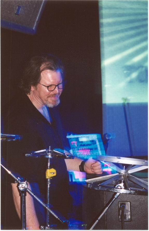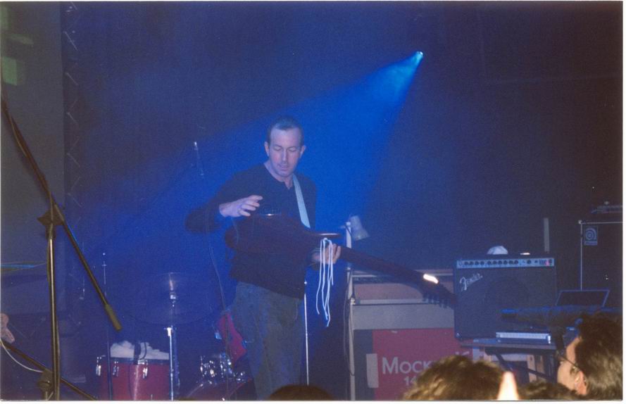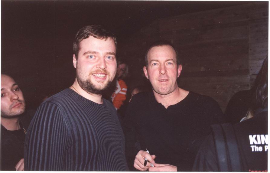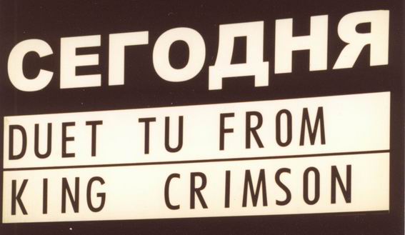 За пятнадцать минут до конца на сцену вышли два отечественных юноши (один с гитарой, другой сел за раз в десять более скромную секцию ударных), которые не испортили впечатления. Слышал, что вместо Ганна Фрипп снова уговорил Левина, а Мастелотто мотал головой и говорил, что он Кинга Кримсона не собирается покидать. Я его успел спросить, неужели Фрипп его не достал за столь долгое время. Он же в ответ весьма жизнерадостно рассмеялся, из чего заключаю, что нет, не достал. Ганн на мои вопросы ответил, что пока в Питере они не будут прописываться, но обещал летом приехать еще раз. Про то, что Сильвиан тоже приезжает они знают, но ждать его в Питере отказались, хотя и обещал каждый день ходить на их концерты. Ганн во время концерта успел сделать несколько снимков на цифровик, а Мастелотто почти все время сидел сиднем. Почти - потому что гвоздем демонстрации его техники было то, что он (на карачках) залез за ударную установку и кидал об пол две тарелки, производившие при этом весьма жалобный звук. Потом он их ловил и снова кидал. Я это снял, но не уверен, как получится. Ганну после концерта было меньше товара паковать, и он всем дал автографы и даже вернул мне фломастер. Мастелотто не стал давать автографов, а как заведенный разбирал свою установку. От помощи с разных сторон деликатно отказывался. Потом, когда разобрал и успокоился (в этот момент я его спросил - что, дескать, он действительно не будет играть на бис - шутка ему понравилась) тоже стал самым неушедшим давать автографы и даже пририсовывал что-то типа пионерского барабана... В общем, жалко, что концерт был только один. Я бы сегодня пошел еще раз... Е. Поляков Теперь немного о московских концертах. 16 апреля 2004 года началось для меня в Екатеринбурге в 2.30 по московскому времени, когда я проснулся, чтобы успеть на первый самолёт домой. Приезд TU всё ещё казался событием не очень реальным, несмотря на недавний визит King Crimson и 21st Century Schizoid Band. По прилёте в Москву я решил, что работа может подождать, и на всякий случай сперва заехал за билетом в клуб. В 22.00 прямо из офиса отправился в Б2: там афиши, возбуждённый народ в ожидании чуда – видимо, всё в силе. Спокойно прошёл поближе к сцене и встал чуть левее центра. Слегка поддатый, но весьма информированный молодой человек слева от меня сообщил, что концерт начнётся в полдвенадцатого, а то и в двенадцать. Причем и это будет чудом. Сзади два любителя постарше рассуждали о преимуществах "Левайна" (такую жуткую транскрипцию я раньше не слышал) и "Брафорда" (а такую слышал не раз). Ещё один молодой человек неподалёку сетовал, что так и не сходил на "кримзонов" летом, хотя на "шизоидах" был. Новый КС ему не очень интересен, т.к. там "нет саксофонов". И вообще МакДоналда он "уважает" больше, чем Фриппа. Мне стало его немного жаль, поскольку я точно был уверен, что саксофонов не будет и у TU J, а для восприятия нынешние King Crimson все равно проще, чем Трэй и Пэт вдвоём. Что до "уважения", тут, конечно, дело вкуса, хотя Фриппу и МакДоналду, полагаю, глубоко по фигу, кого из них уважают больше, но с точки зрения вклада в музыку обоих музыкантов сравнение не совсем в пользу Йана, при всем к нему уважении. Наконец началось самое интересное. То, что происходило на сцене, нельзя назвать просто концертом. Происходило то, что принято называть мультимедийной инсталляцией или представлением, как угодно. 