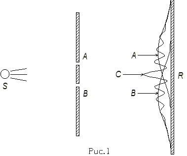 В относящихся к предмету статьях и книгах вы многократно найдёте схему эксперимента, воспроизведённую на Рис.1. Электроны (протоны, фотоны), испущенные источником S, летят в сторону экрана с двумя отверстиями А и В. Вследствие взаимодействия с экраном электроны, прошедшие через отверстия, рассеиваются. Их распределение регистрируется счётчиками частиц или фотопластинкой в плоскости R. Если открыто только отверстие А или только отверстие В, распределения имеют вид, показанный кривыми А и В. Если же открыты оба отверстия, распределение не равно простой сумме кривых А и В, а имеет осциллирующую форму С. Явление называется "интерференция". Важно подчеркнуть, что это не коллективный эффект: даже при очень слабом потоке частиц, когда в аппаратуре в среднем находится менее одной частицы и случаи с двумя и более частицами погоды не делают, картина интерференции сохраняется, увеличивается только время её "проявления", например, накопления достаточного количества точек почернения на фотопластинке, чтобы они вместе выглядели как цельный объект. Таким образом, каждая отдельная частица ведёт себя как волна, проходящая через оба отверстия и интерферирующая в плоскости регистрации сама с собой.