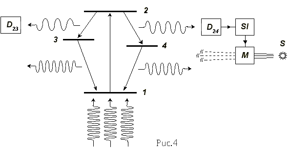 Если в эксперименте по схеме Рис.3 атрибутами являются координаты и импульсы, то в схеме Рис.4 это энергия и время. Здесь электрон изолированного иона, удерживаемого в магнитной ловушке, может находиться на четырёх энергетических уровнях. Интенсивная световая "накачка" быстро переводит электрон с нижнего уровня 1 на верхний уровень 2, откуда он через промежуточные уровни 3 и 4 возвращается на уровень 1, чтобы сразу быть снова заброшенным на уровень 2. Кванты излучения, соответствующие переходам 2 --> 3 и 2 --> 4, фиксируются детекторами D23 и D24. Кроме того, ион подвергается информационному воздействию через свет, испускаемый источником S и прошедший через модулятор М. Модулятор, в свою очередь, управляется источником информации SI, который запускается для передачи нового пакета информации (следующего такта музыки или следующего урока Lincos'а) от детектора D24 , что замыкает цепь обратной связи.